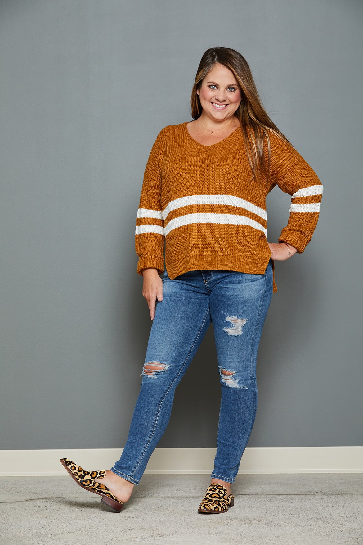 Erica is a petite 5’2” and finding ankle denim that works on her frame is tricky. Layer in the “what shoes do I wear with this?” question, and she’s facing multiple challenges. When it comes to pairing ankle jeans with shoes, there’s only one rule to follow: show that ankle bone. Showing your ankle elongates your leg by visually breaking up your calf and your foot. We love the Kristin Cavallari bootie with ankle denim because the cutouts highlight your ankle, and the open toe is perfect for transitioning into fall. For a flat option, trade your Birkenstocks for slides. This leopard print goes with everything, and the open back makes for a fresh and flattering pairing with ankle jeans. Insider tip: get your perfect length without alterations by casually cuffing or rolling the hem.