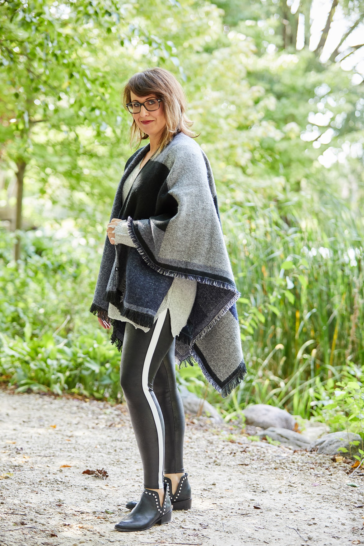 Shop Katie’s look: Echo Ruana | Stitches and Stripes Sweater (3 colors) | Spanx Side Stripe Leggings | Kaanas Booties | Katie is 5’5″ and wearing size S tops, size M leggings and size 9 shoes.