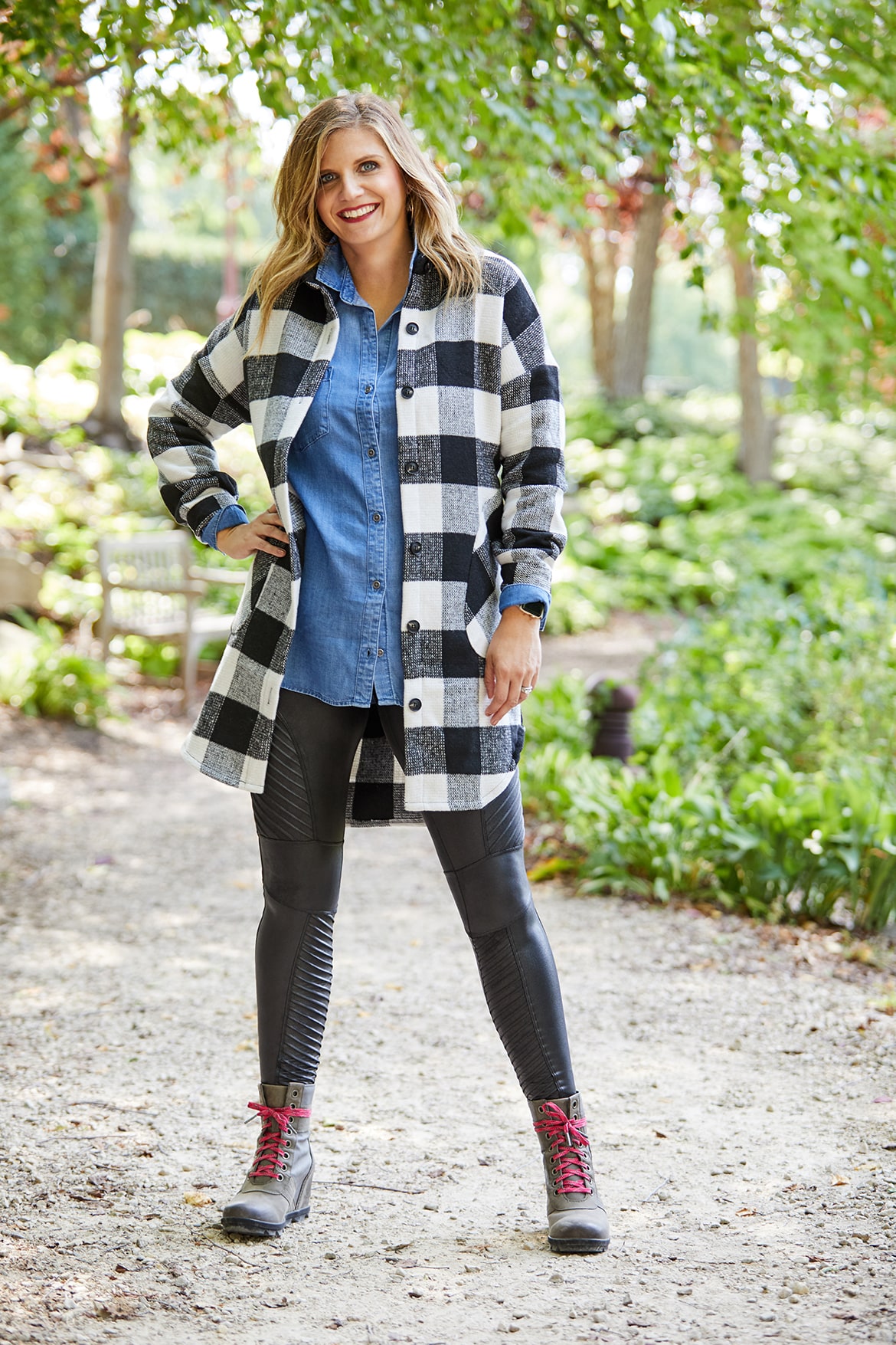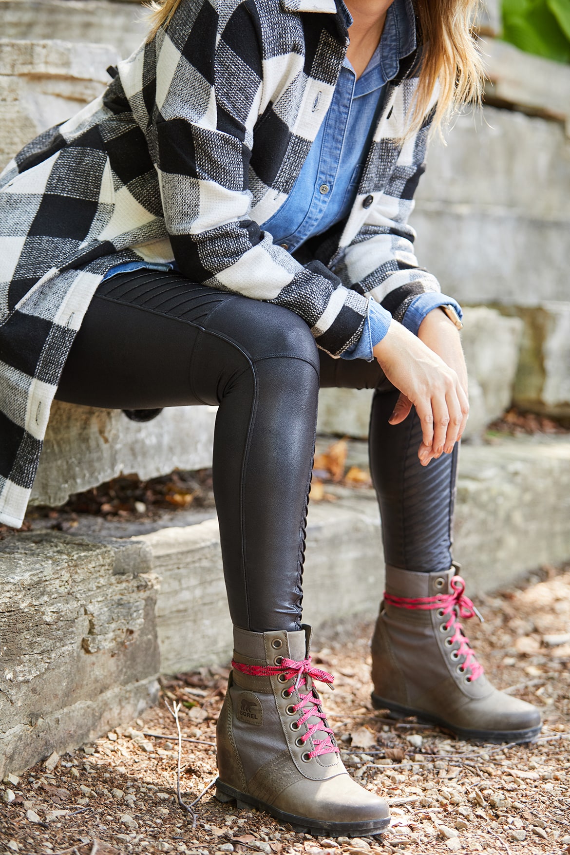 Shop Kari’s look: Rd Style Shirt Coat | Cloth and Stone Buttondown | Spanx Moto Leggings | Sorel Wedges | Kari is 5’7″ and wearing size M tops, size M leggings and size 7 shoes.