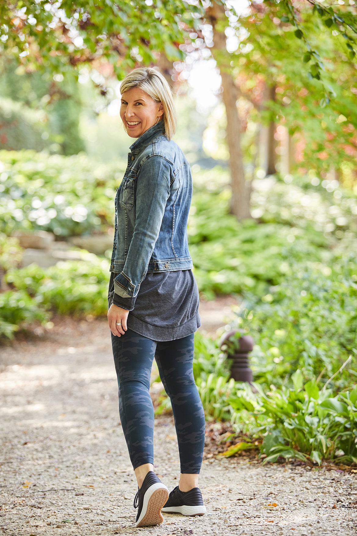 Shop Meg’s look: Kut from the Kloth Denim Jacket | Z Supply Tunic | Spanx Camo Leggings | New Balance Sneakers | Meg is 5’6″ and wearing size S tops, size S leggings and size 8.5 shoes.