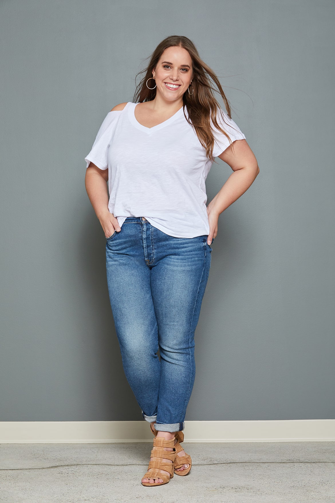 We have been craving a fresh pair of boyfriend jeans for fall, and Abby—the customer care specialist who answers your questions on Facebook Live—was the perfect model to rock this silhouette with confidence. Boyfriend jeans are the hot sauce in our denim diet—they go with everything and add a dash of something to even the most basic combination. We styled Abby in the Seven For All Mankind Josephina, updated for the season with a higher rise (instant smoothing effect) and an incredible new vintage-luxe fabrication (all the vintage look without any of the rigid feel). We love the roll of this jean—perfect for showing off some ankle whether you have long legs or are petite. Roll as much or as little as needed. And the straight leg style is a great evolution of the skinny without requiring a shoe change.